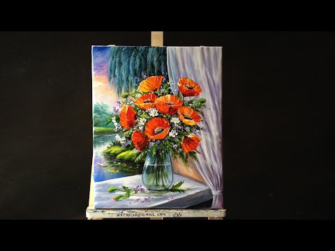 Bouquet Of Poppies In Glass Vase On Windowsill Acrylic Painting