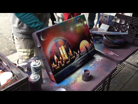 New York spray paint artist, city scape and freedom tower